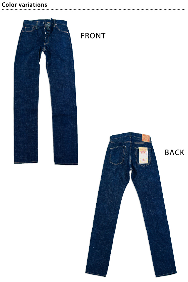 経糸にムラ形状のテキサスコットン100%による6番糸、染めは50年代のデニムのイメージでやや青の強い深みのあるインディゴ色に染め上げています。