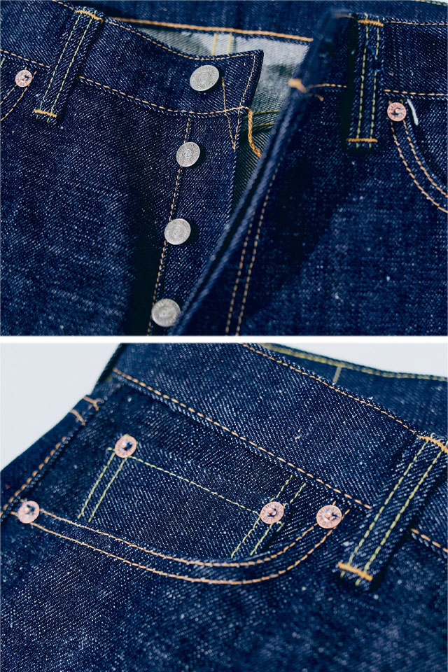 縫製についても、当時のジーンズの雰囲気を表現すべく、ALL綿糸はもちろんの事、糸色・番手・運針・ステッチ幅など、こだわりの仕様としています。