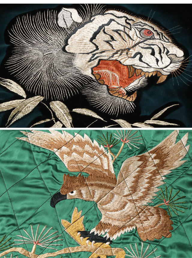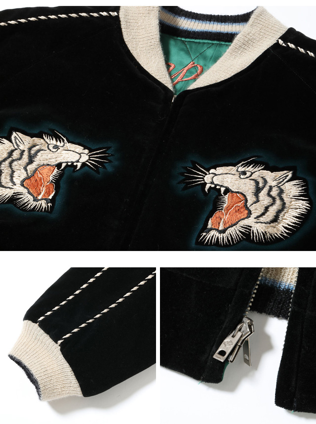 刺繍は1950年代中期の「タイガーヘッド」と呼ばれる絵柄で、白虎の顔の周りにはブルーのステンシルが噴かれ、黒い別珍から浮き出てくるかのような迫力。